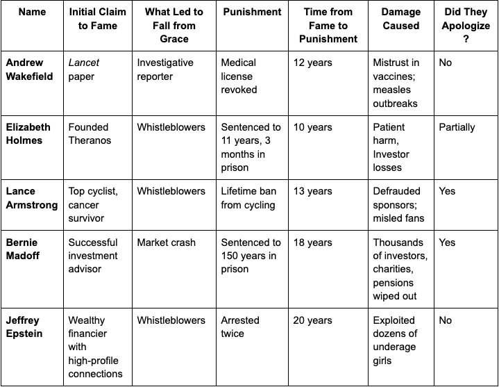 Note how many years pass between fame and headlines of fraud - in our five examples, 15 years on average (See table). “I view this situation as one big lie that I repeated a lot of times,” Armstrong eventually confessed.