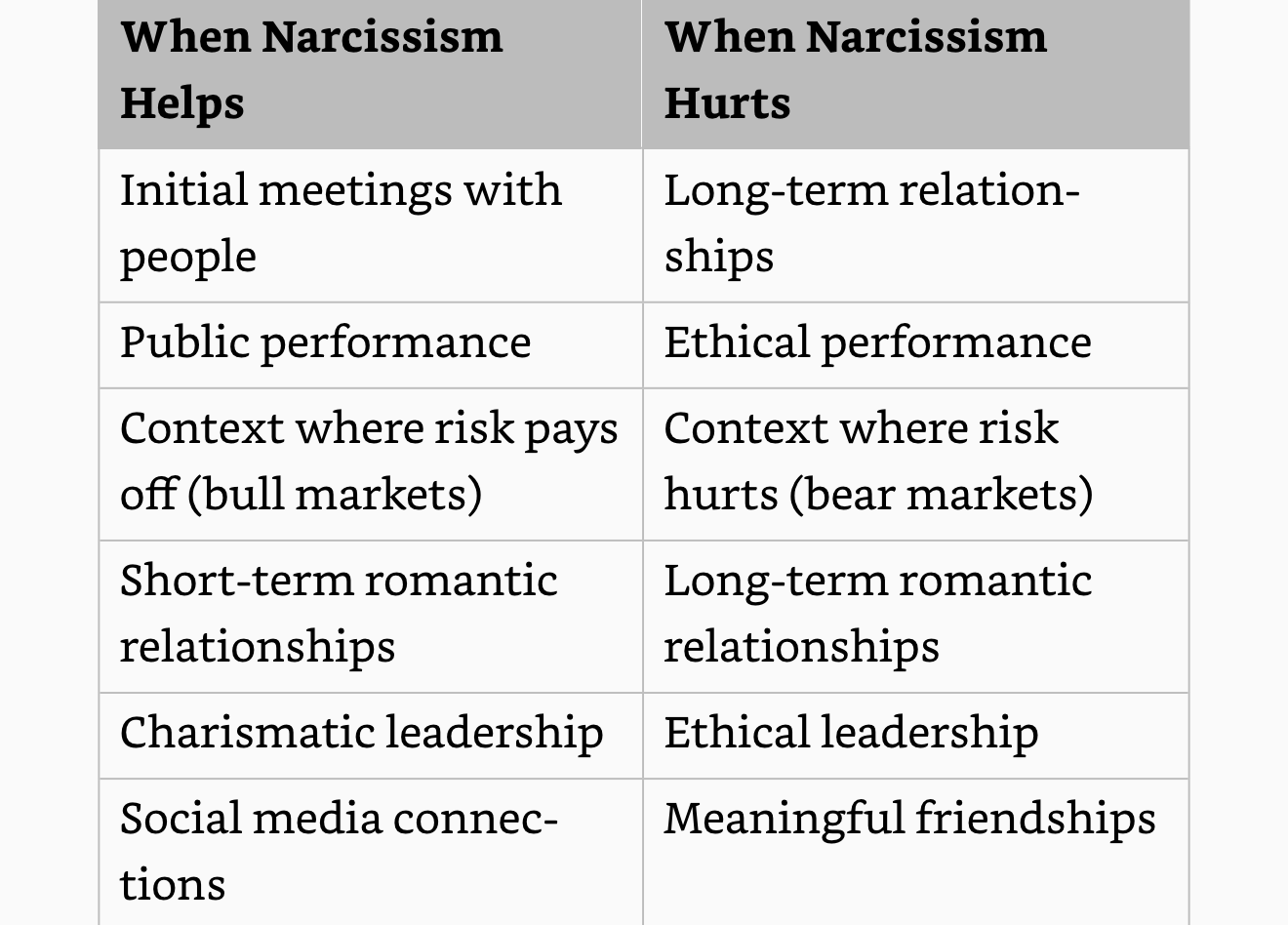 OK, so let’s suppose it’s narcissism that unites all Jekylls. First, Campbell reminds us that narcissism is not necessarily a bad thing. Look at this fascinating table from his book.