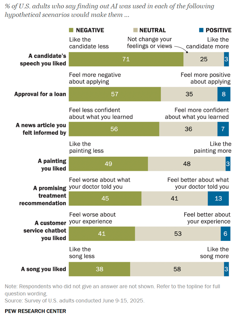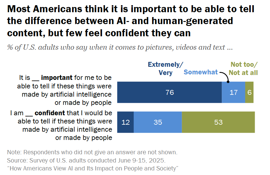 This limitation of AI is understood by the majority of Americans, and they don’t like it. A recent Pew Charitable Trust survey showed that 94% of Americans want to know whether an article was AI-written; 53% (correctly) feel they couldn’t tell whether it was; and 56% would feel less confident in the article if it was.
